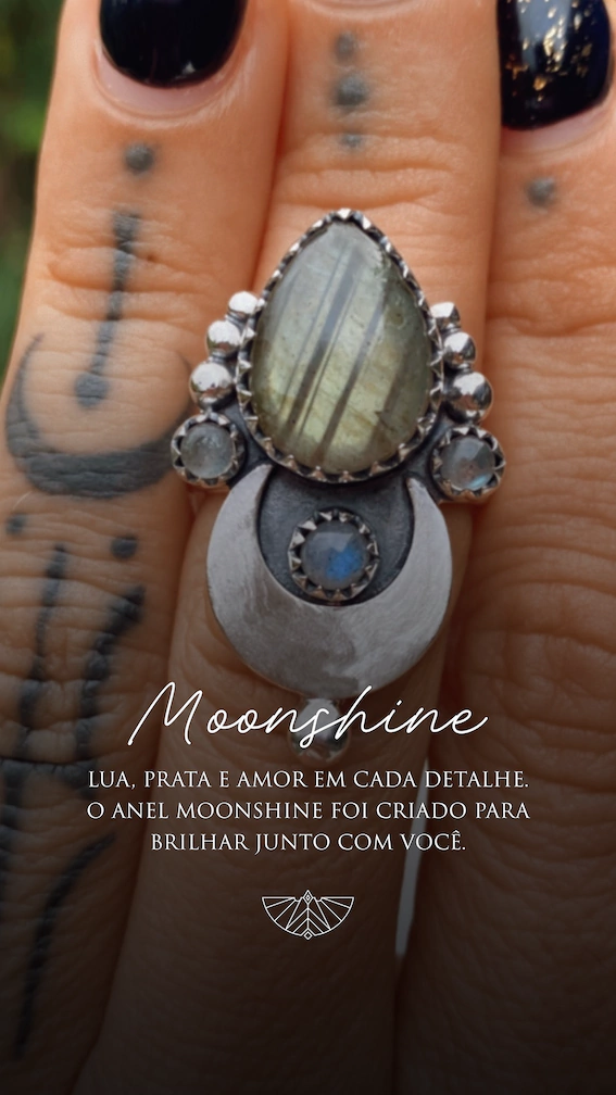 O Anel Moonshine na Prata traz a lua prateada. Temos ele com duas opções de pedras: pedra da lua e pedra labradorita.